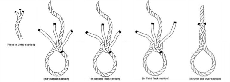 Another approach is to separate the strands, create an eye, and then braid them over the exterior of the rope; this over-braid will tighten and grip as tension is applied to the eye.